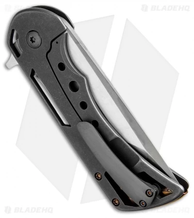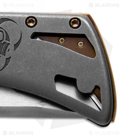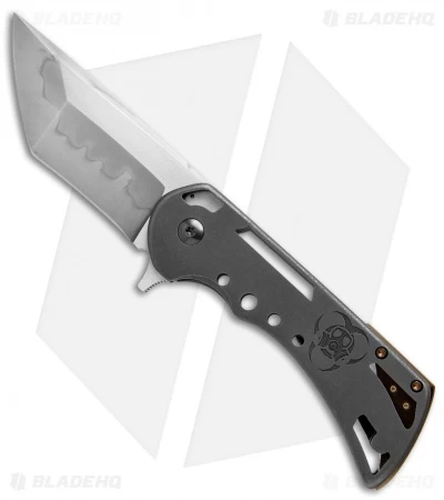 This Rick Barrett Custom knife offers an impressive design with the intricate attention to detail that Mr. Barrett is known for. The handle is set apart with skeletonized titanium construction, zirconium pivot, and a gold anodized backspacer with glowing tritium inserts. It has a tanto style blade with a flat grind and a Hamon finish. A zirconium pocket clip adds a nice finishing touch to the design.