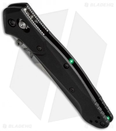 The Benchmade 940-2 Osborne offers the proven Benchmade Osborne design of the original, now updated with a black G-10 handle. The Benchmade 940 is a popular knife for good reason. It’s a comfortable everyday carry knife with its slim design, great ergonomics and light weight. The handle is outfitted with black G-10 scales with green anodized barrel spacers. This model has a satin finished blade with a plain edge. The AXIS lock and reversible pocket clip make the knife usable for right or left-hand users.