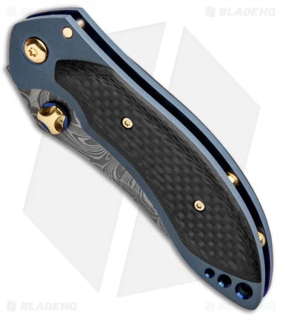 The Gold Class knife features an acid etched Grosse Rosen Damasteel stainless Damascus with crowned spine and modern reverse curve interpretation. Hand convexed edge. 6AL-4V titanium handles anodized. Bead blasted exterior and Jeweled interior. Custom milled and sanded carbon fiber onlays. 24K gold plated hardware, clip barrel spacers and thumb-stud w/ anodized spacer. Custom presentation box. Limited run of 195 pieces. Serial numbered.