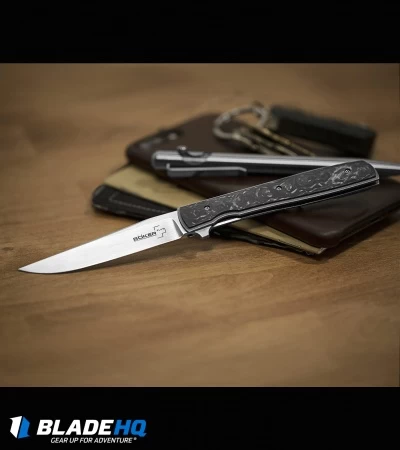 Designed by Brad Zinker, the Urban Trapper is inspired by classic Trapper knives and has become one of Boker’s most popular gentleman’s knives. It’s an appealing knife with a slim build and high-grade materials. The premium VG-10 stainless steel clip point blade rides on an IKBS ball-bearing pivot for smooth, no-nonsense action. This exclusive model of the Urban Trapper features a carbon fiber handle with a titanium frame lock and a deep carry pocket clip.