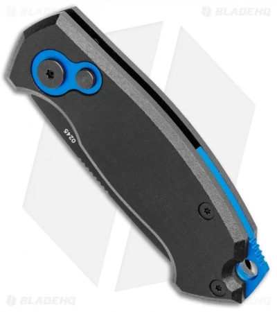 This Blade HQ Exclusive Boker Vox Kompakt is a CA-legal automatic knife featuring a black D2 blade and a black handle with a blue inlay and back spacer.