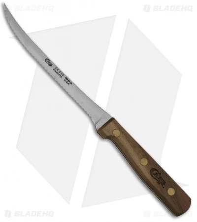 The Case Cutlery Tomato Slicer is a fixed blade knife, great for cutting vegetables in the kitchen. The stainless steel, trailing point blade has a satin finish and a fully serrated edge. The handle is made of walnut wood for a sturdy yet comfortable grip.