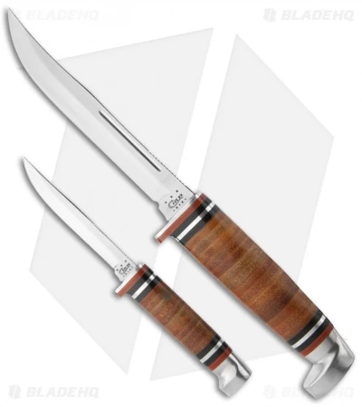 There are two Leather Hunter Fixed Blade knives that come in this set. The larger knife features a clip point stainless steel blade (5-1/8″) with blood groove and has a hollow grind. There is aggressive jimping along the base of the spine. The polished leather handle has a large stainless steel pommel and long guard. (316-5 SS)