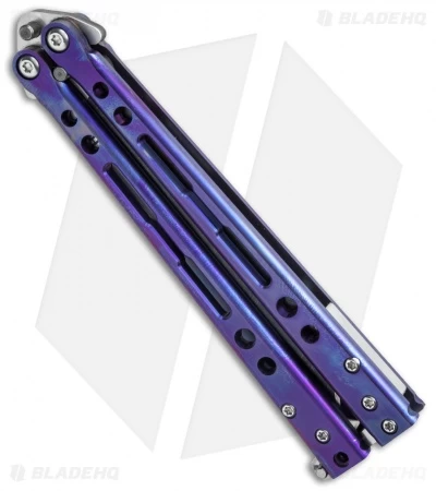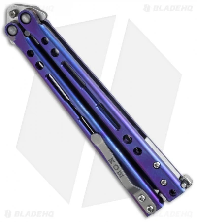The Specter Evo has a two-tone acid wash/satin finished Elmax steel blade for cutting performance akin to your favorite everyday carry folder. Titanium handles on the Specter feature “Butterfly Closure” slots. The handles on this Specter Evo are purple anodized with a satin finish. Includes titanium spacers, latch (removable), and pocket clip. The Specter utilizes Hom Design Precision Bushing System with phosphor bronze washers for exceptional flipping performance.
