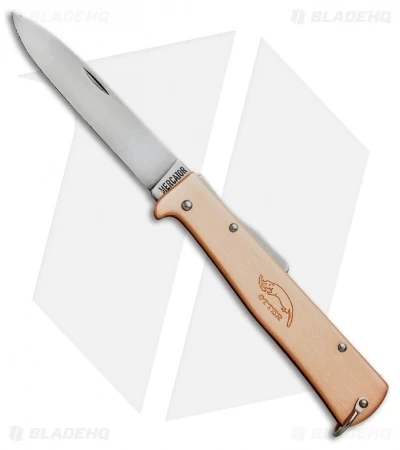 The Otter Mercator offers a minimalist design, built tough enough for everyday use and carry. It has a one-piece integral handle with a slim profile that rests comfortably in the pocket or hand. The sturdy lockback mechanism provides rock solid lock up and quick blade release. A bail loop and a nail nick opener add a classic touch to the design. This Mercator model has a copper handle and a stainless steel blade with a satin finish.