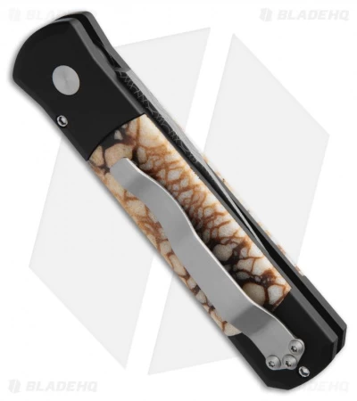 This Custom Godson has a Devin Thomas Damascus steel blade and black anodized aluminum handle with Natural Tiger Coral inlays. Custom titanium pocket clip, satin hardware and mosaic pin push button.