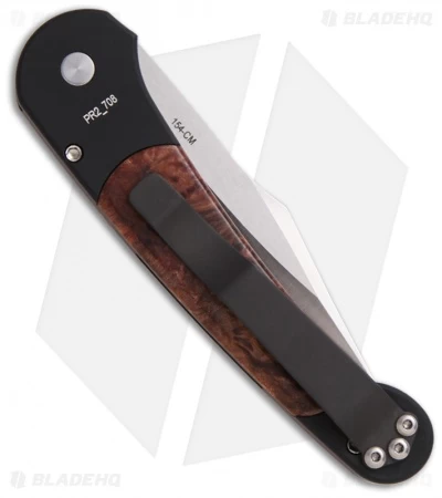 This Monaco knife has a satin finished 154-CM stainless steel blade with a plain cutting edge. The handle is black anodized with Maple burl inlays, satin hardware and a black tip-up carry pocket clip.