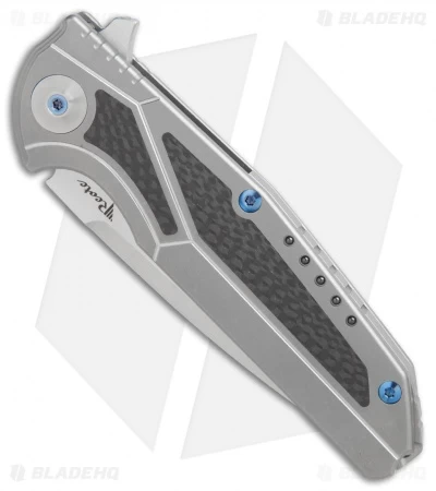 This K-4 model has a satin finished recurve blade made from Bohler M390 stainless steel. It comes outfitted with carbon fiber inlays and blue anodized hardware.