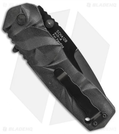 The SCHA12B Schrade MAGIC Dual Action assisted opening knife has a black finished, plain edged blade and a black coated aluminum handle.