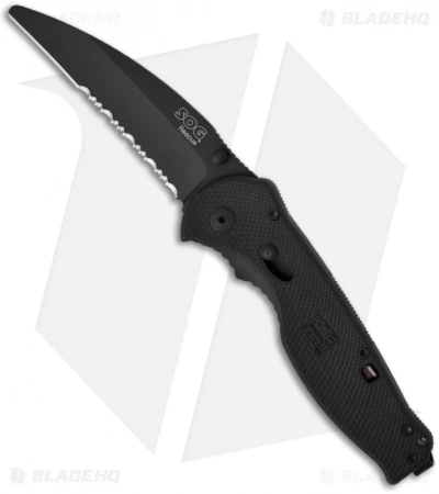 This Flash II Rescue (TFSA-6) has an AUS-8 stainless steel sheepfoot blade with a blunt tip, partially serrated edge and a black TiNi finish. The lightweight black glass-reinforced nylon handle is durable and features a diamond non-slip texture.