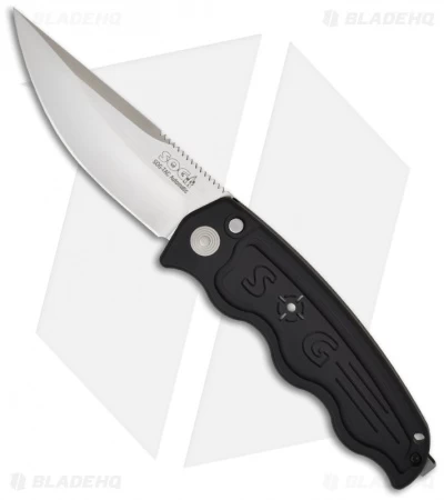 The ST-01 SOG-TAC has a satin finished AUS-8 stainless steel clip point blade with a plain cutting edge. The black anodized handle is machined 6061-T6 aluminum with comfortable finger grooves and a safety to lock the blade open and closed.