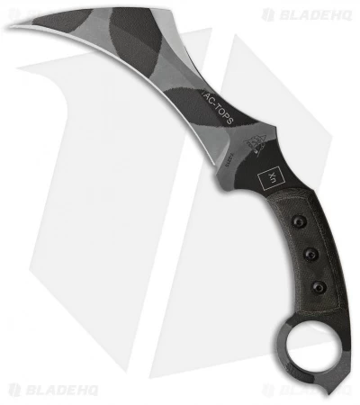The TAC-TOPS Karambit offers an intimidatingly large hawkbill blade with a unique top edge grind for added cutting power. An oversized finger hole and micarta handle scales provide a tactical grip in the harshest conditions. The TAC-TOPS was designed by C. Despins of Max Venom Product Group and produced by Tops Knives for a highly elite military unit.